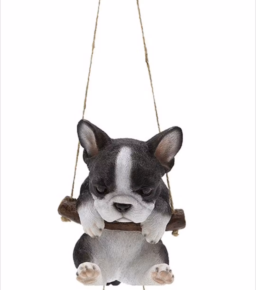 Fræk Boston Terrier hvalp 12cm som havedekoration til ophæng. Sort-hvid hundefigur vejrbestandig til udendørs.